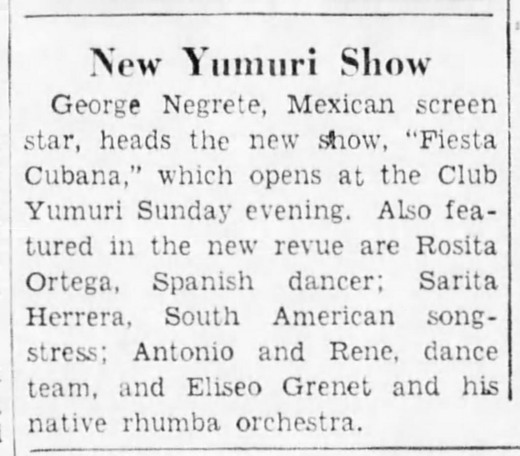Con este ilustre músico cantó Sarita Herrera el 16 de abril de 1937 en el Club Yumurí, de New York, cuyo propietario era precisamente Grenet. Allí se presentaría el 2 de julio de 1937 con el popular cantante y actor de cine mejicano Jorge Negrete. Posicionada del ambiente artístico musical de esa ciudad se convierte en estrella de los ‘shows’ de los hoteles Waldorf Astoria, Havana-Madrid, Ambassador, Newyorker, Copacabana, La Conga, Martinique y Stork Club; sitio donde trabajaba de planta la orquesta de Johnny Rodríguez, hermano del cantante Tito Rodríguez quien también participaba en la agrupación.